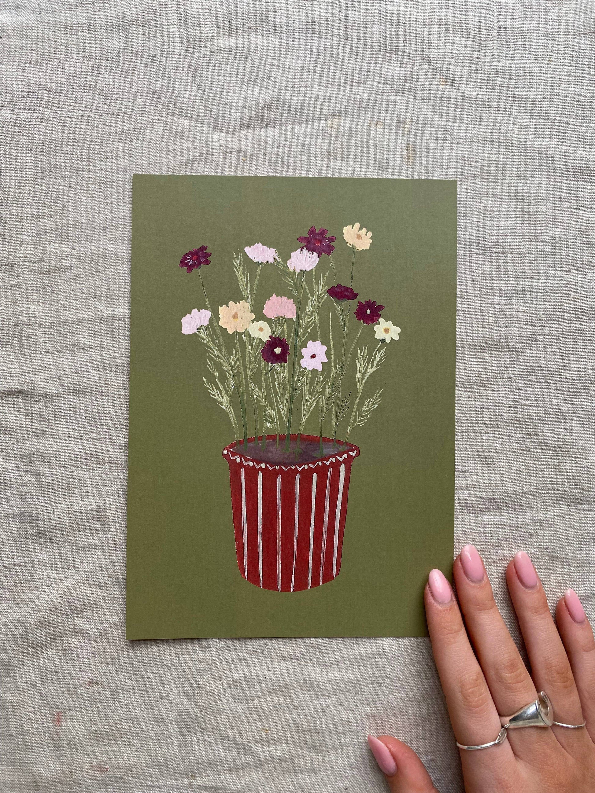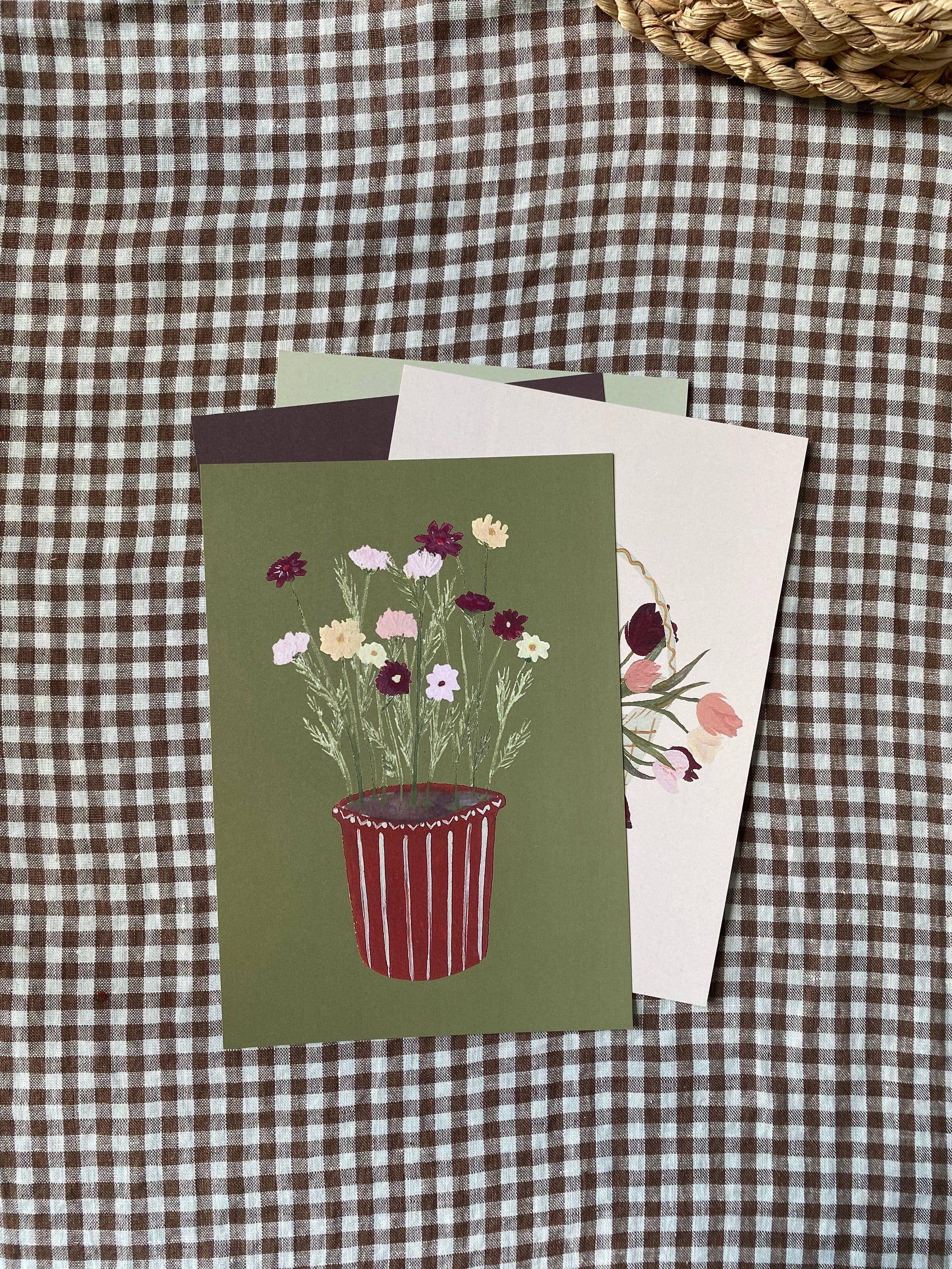Hand painted in Gouache, and printed in England on textured part recycled paper at 300gsm. These cheerful prints are inspired by the spring and summer blooming flowers. Backed and protected by a cellophane sleeve.