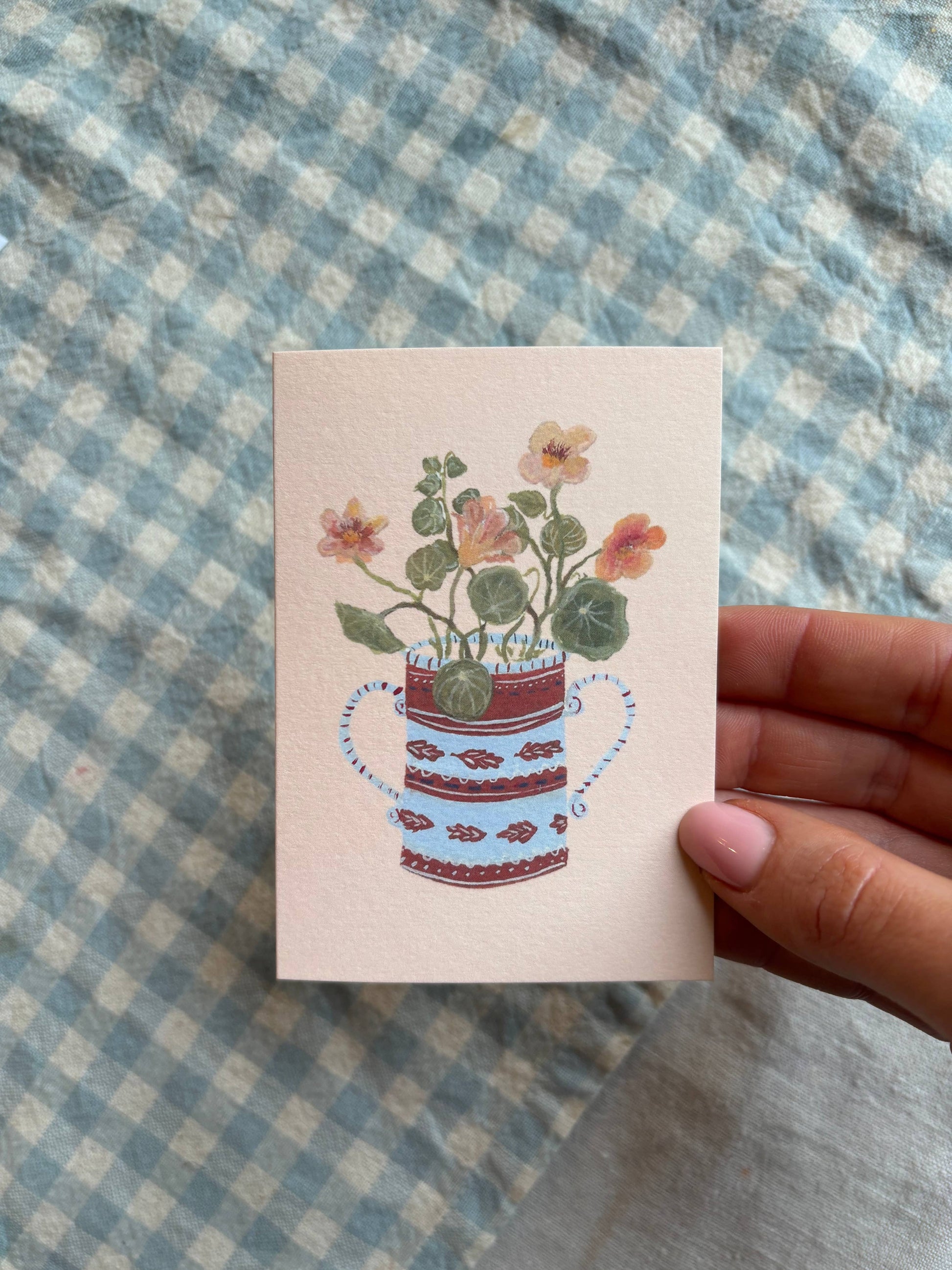 A7 greetings card (105x74 mm) Each and every piece starts as a gouache painting. All greetings cards are printed on FSC certified paper using vegan inks, then supplied with a natural envelope and plastic-free packaging.