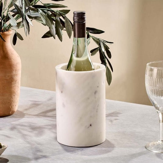 The white marble wine cooler will enhance any party. The striking variegated tones and smooth tactile finish of the luxury marble makes it the perfect accessory for entertaining. Suitable for one bottle only.
