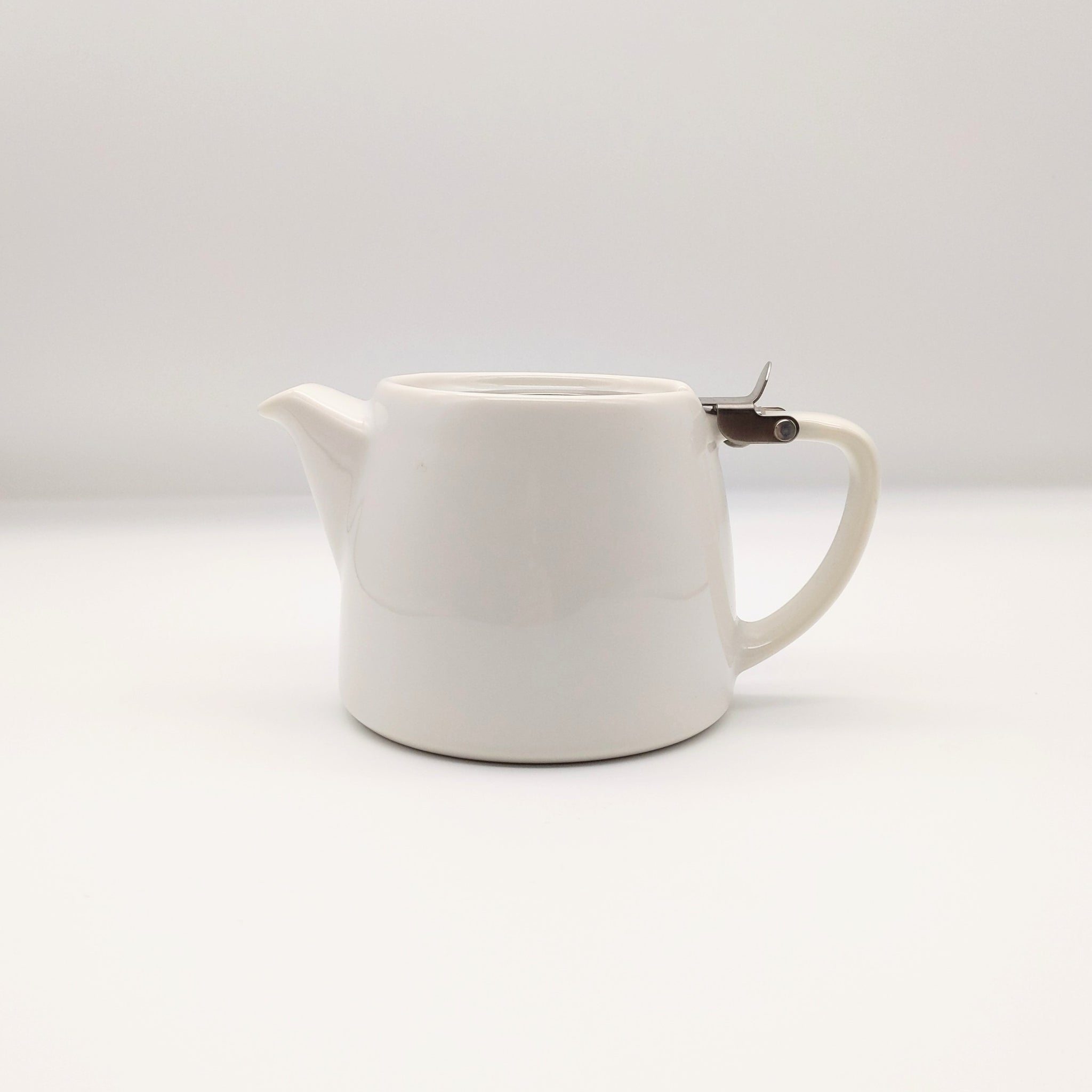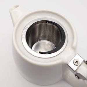 The pot is ceramic with a stainless steel lid, and contains an internal basket infuser with condensed extra-fine holes to circulate the loose tea effectively. All parts are dishwasher safe, and baking soda dissolved in warm water can be used to clean any stubborn tea stains as needed.