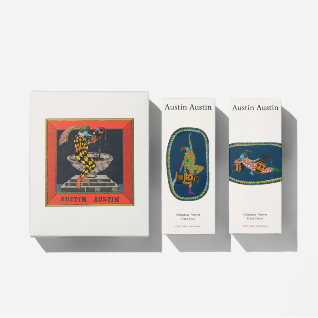 Palmarosa & Vetiver Hand Soap and Hand Cream in a gift box with print by artist Christian Newby (2019).