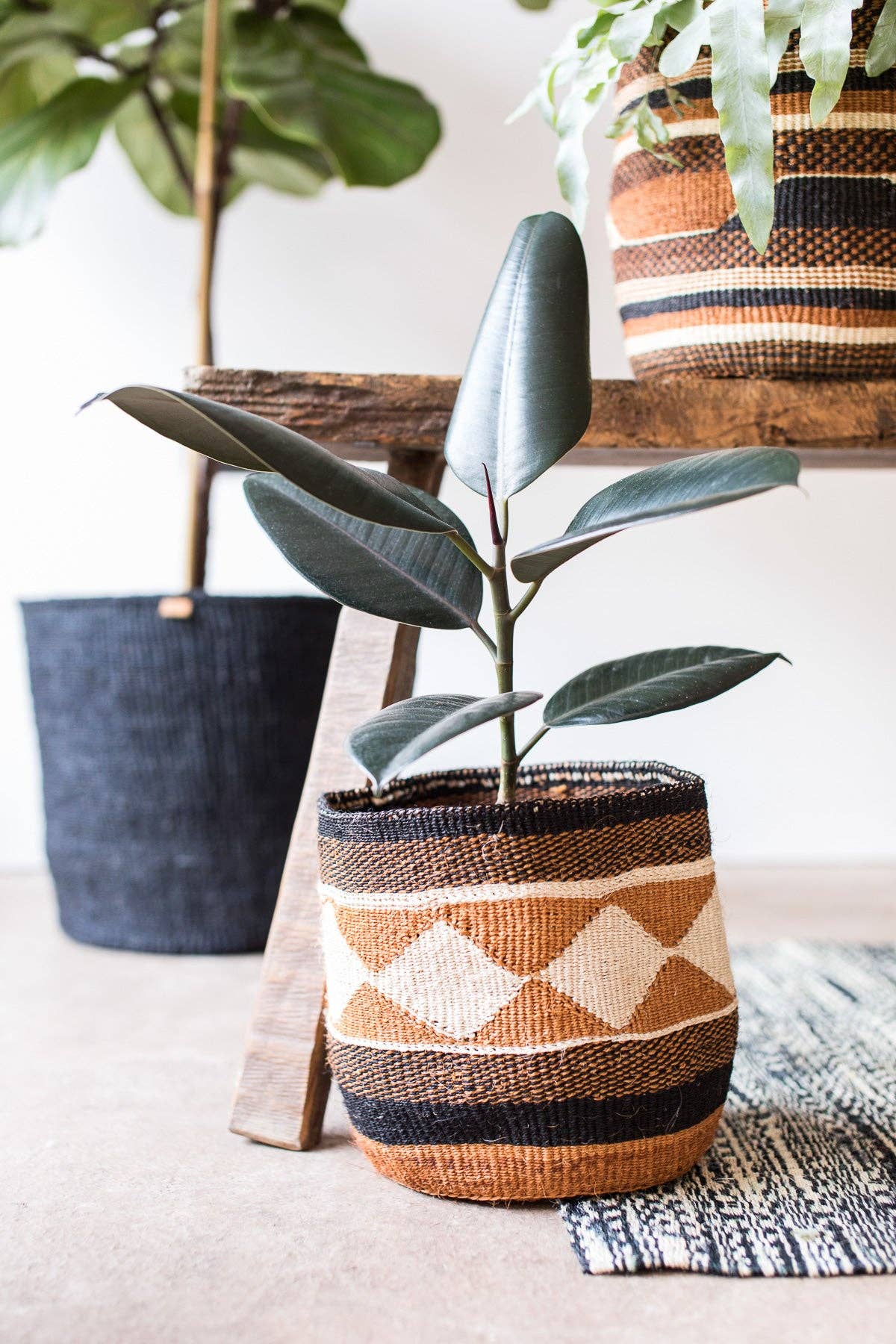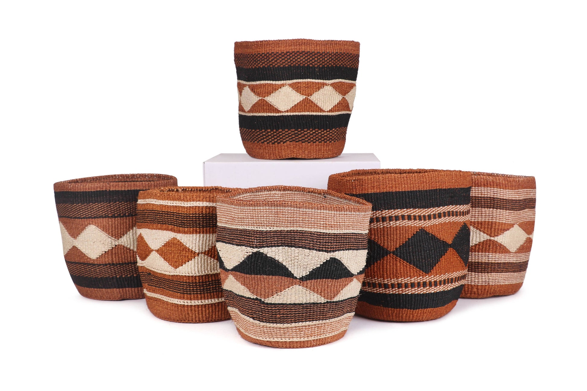 These patterned baskets are hand woven in rural Kenya by a skilled craftswoman working with her preferred weave patterns and choice of natural dyes. The making process is laborious and highly skilled. Sisal grass is hand stripped using wooden tools and bare feet, and then it is hand rolled to a very fine twine on the thighs before being woven using a classic twining technique. The dyes used to create the stunning layers of colour in KADI are 100% natural, and hand-dyed in large vats of boiling water.