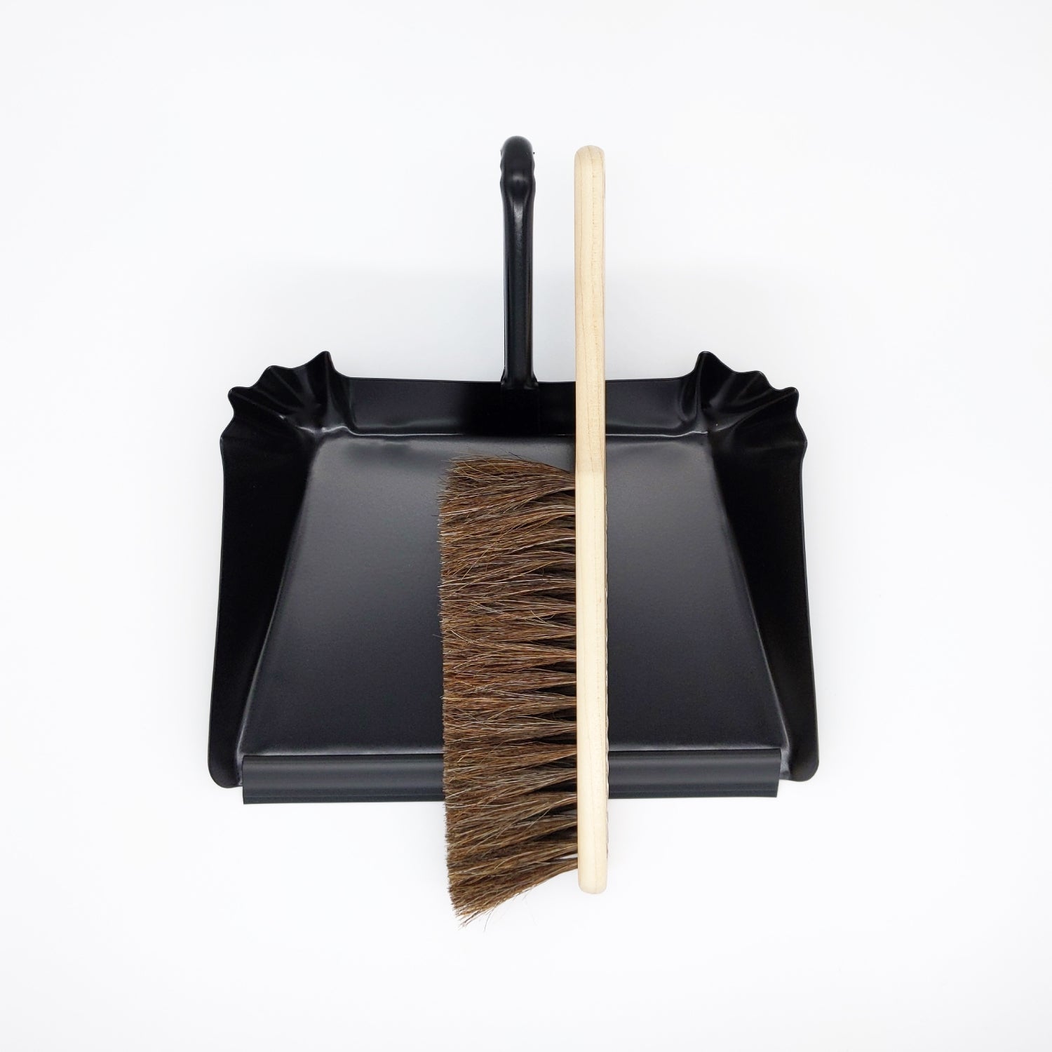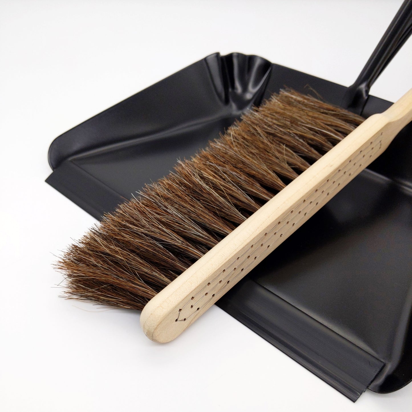 A slim natural hand made maple brush with horse hair bristles and black metal dustpan that is suitable for indoor or outdoor use.