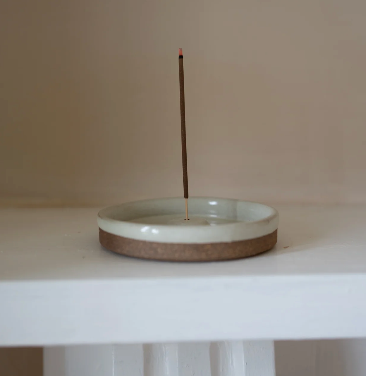 A round ceramic incense stick holder. This design catches the ash within the dish and the incense burns beautifully. Handmade small batch pieces from an Artisan pottery in Southern India. Pottery designed in the UK and created under a Fair Trade scheme to help sustain and grow the community of artisan makers.