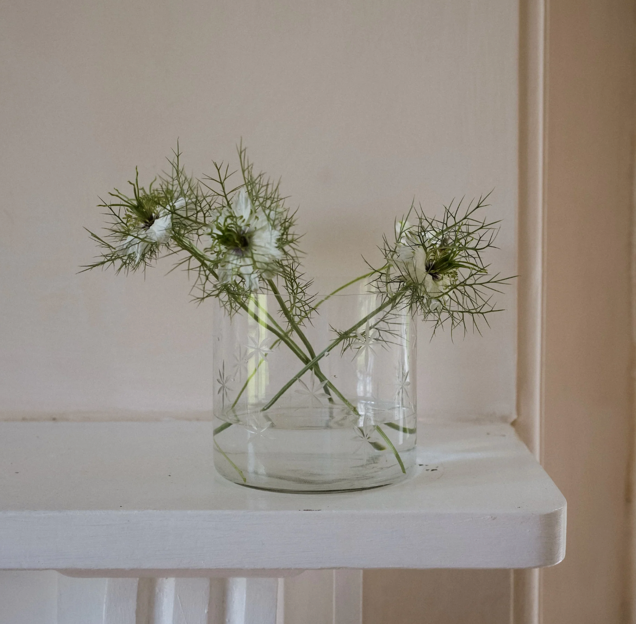Wide hand blown etched glass vase with a lovely little star design. Style this vase with seasonal flowers around your home. We love using it on the kitchen table, on a chest of drawers in bedrooms and hallways or mixed in groups with our other vases to make a centrepiece for the table both inside and out in the garden.