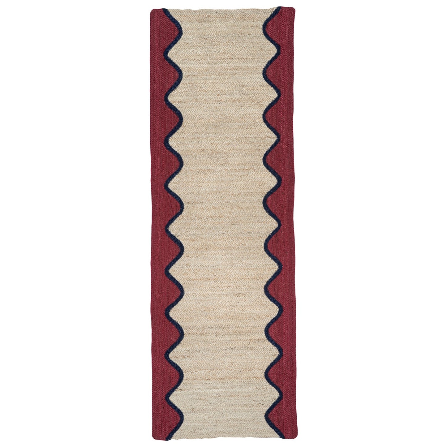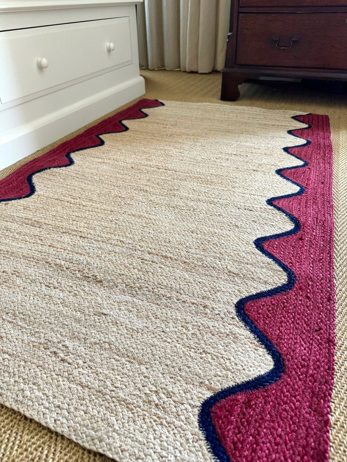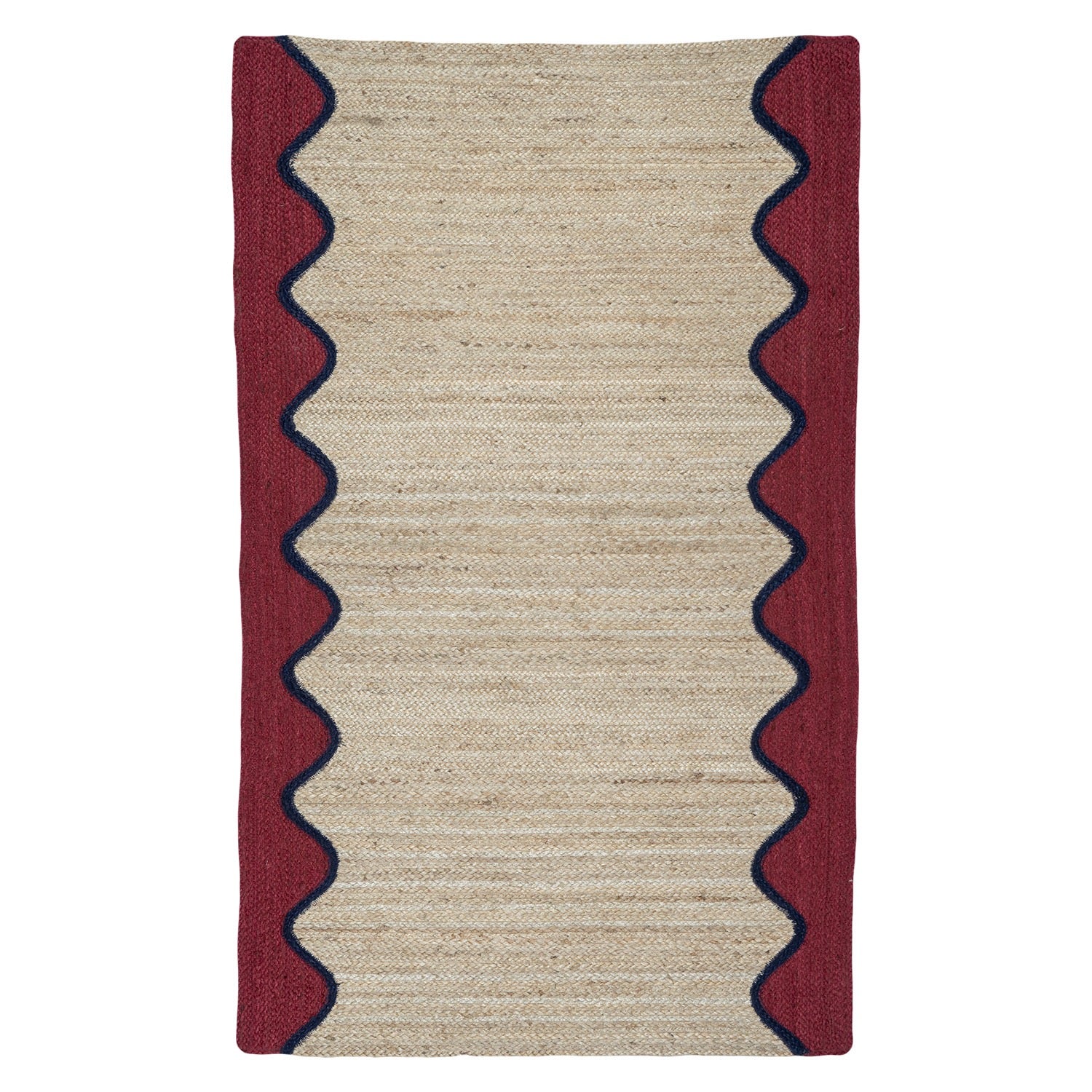 Wave Jute Rug with colourful borders pattern in Burgundy/Navy